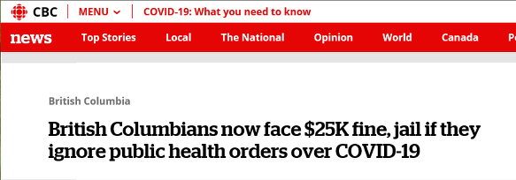 - People who ignore public health orders can now be jailed or fined upward of $25,000. 공중보건명령을 어기는 사람은 최고 CAD$25,000의 벌금이나 투옥될수 있습니다.