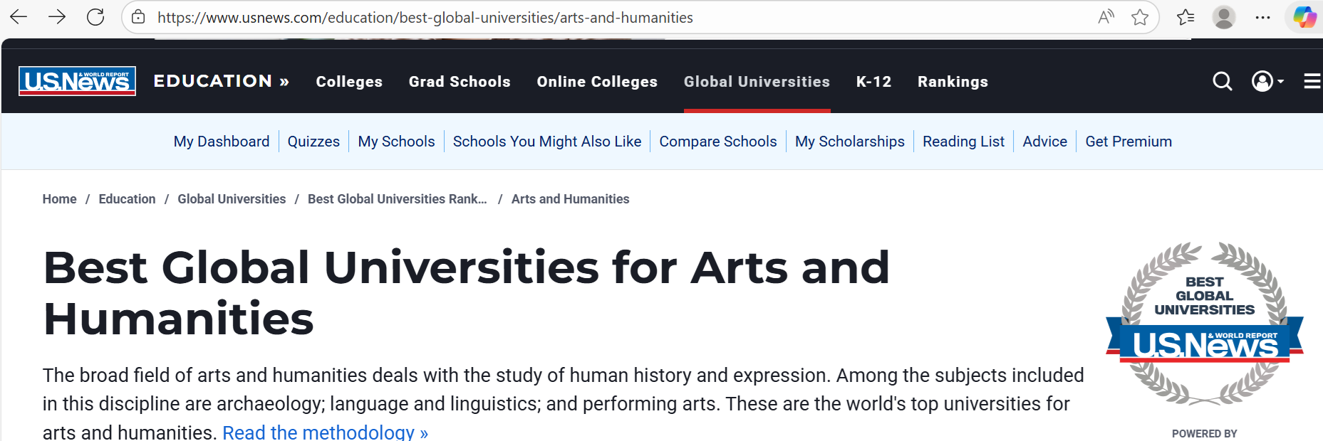 U.S. News & World Report 유에스뉴스엔월드리포트는 매년 Best Global Universities Rankings 베스트글로벌유니버시티즈랭킹즈를 발표하고 있고 최근판은 이곳을 클릭하면 볼수 있습니다. 2025년 6월 16일 발행된 Best Global Universities for Arts and Humanities 인문학분야 세계대학랭킹을 정리 소개합니다. 심사된 인문학분야는 Language & Linguistics 언어 언어학, English 영어 불어 등 언어전공, Archeology 고고학과 고전학, Philosopy 철학, Religion & Theology 종교 신학, Performing Arts 방송연예 등 관련전공분야들을 포함합니다.